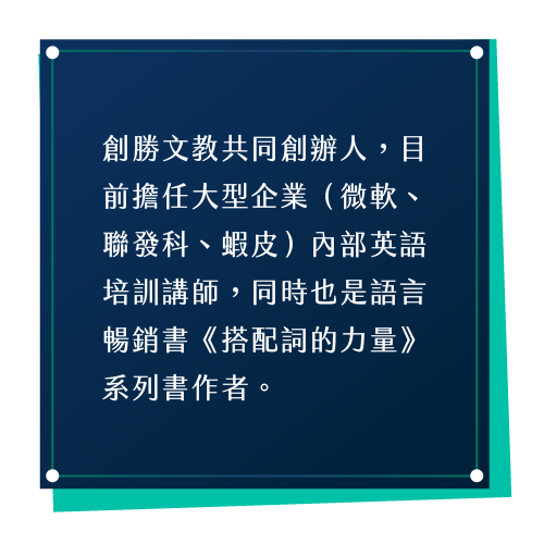 ► 2015 年創立「創勝文教」,至今舉辦超過 500 場英語學習講座,擔任微軟、聯發科、Deloitte、LVMH、Gogoro 等大型國際企業的英語內訓講師