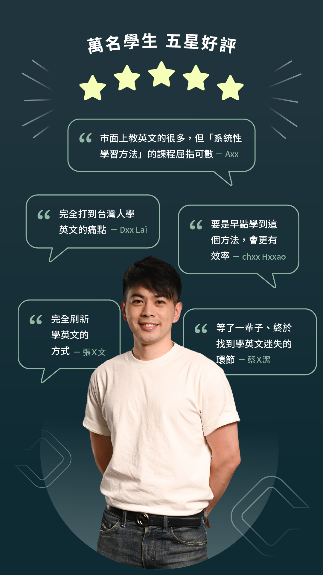 ► 擁有美國哥倫比亞大學、賓州大學雙常春藤名校的語言學習科學背景,於 Hahow 好學校開設《3D 英文筆記術》、《英文思維模板術》課程,累積超過萬名學生。