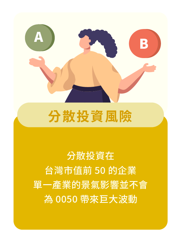 投資 0050 就好像間接持有這 50 大企業,分散風險,也讓你的投資跟著台股的趨勢成長。