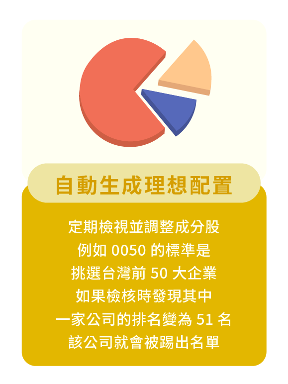 因此投資人可以用比基金低的成本,追蹤整體市場趨勢的報酬率,並且自動化調整持股