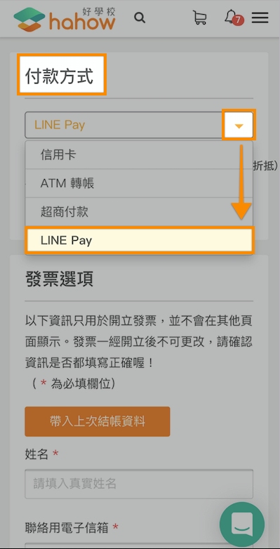 1. 在 Hahow 付款頁面選擇「LINE Pay」為付款方式