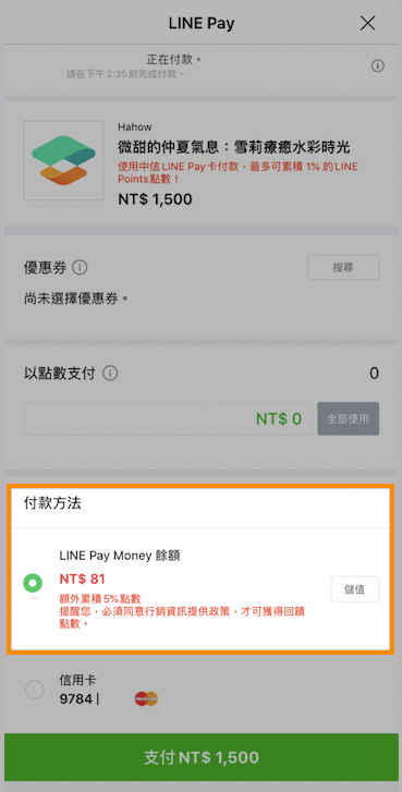 2. 在 LINE Pay 付款頁面選擇「LINE Pay Money」為付款方法