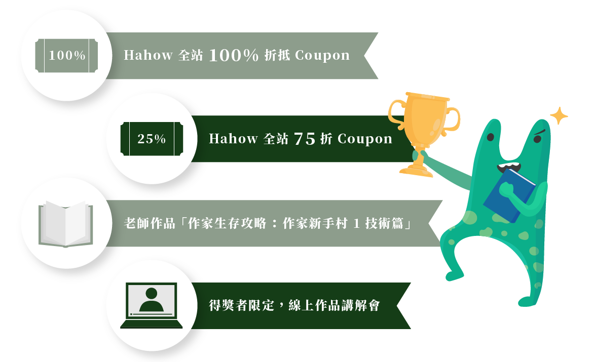 此外,特優得獎者可以獲得 Hahow 全站 100% 的 Coupon 折抵券,及老師著作一本