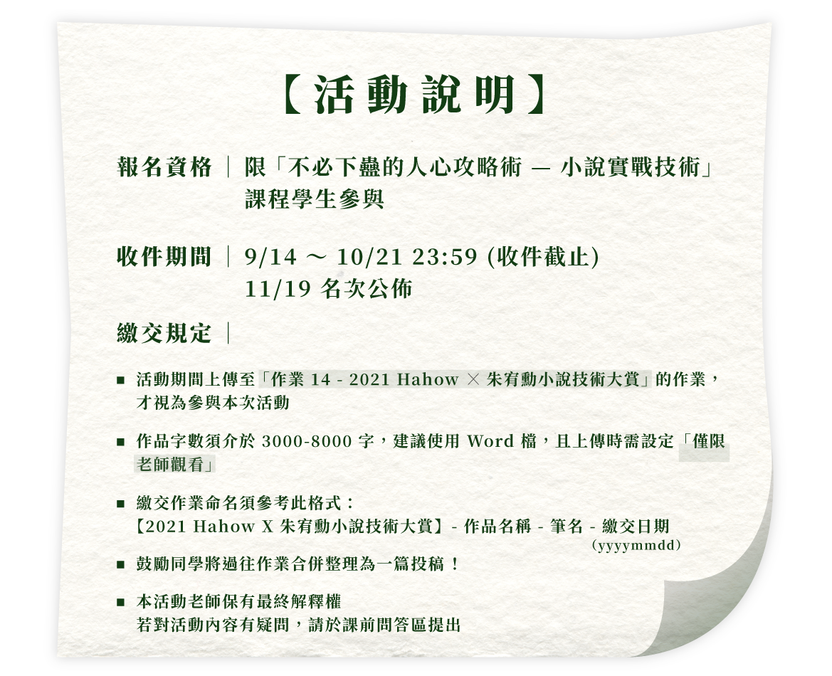 「 2021 Hahow X 朱宥勳小說技術大賞」 是由 Hahow 與朱宥勳聯合舉辦之線上文學獎