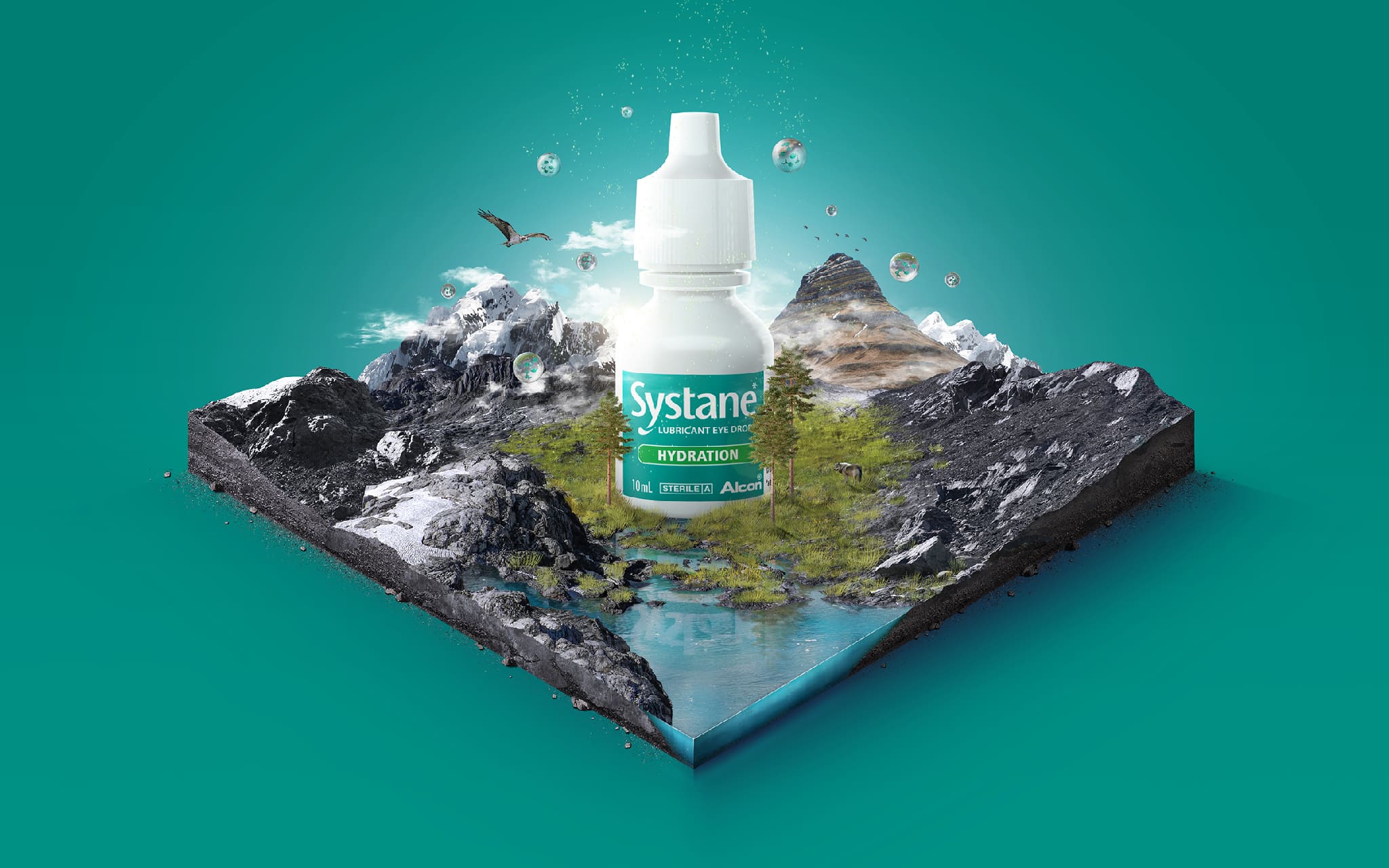 概念發想現代人用眼過度,眼藥水相關產品也因應而生,而以往台灣的眼藥水廣告都是找藝人代言,大眾往往只認藝人、不認品牌視覺,所以這次客戶期望可以打破規則,創造新的視覺挑戰,最後我們決定要做一個很有趣的主視覺,用影像合成建構一座環境豐饒的水漾島嶼,以眼藥水為中心向外擴散,形成獨有的超涵水生態系,來強調產品的最大特點「保濕鎖水」,提升記憶點也創造話題性。