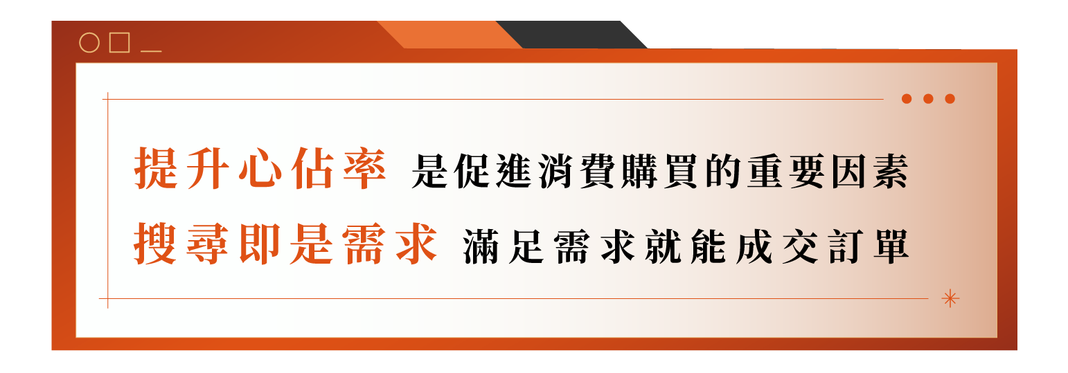 不論你是從 0 到 1 剛起步的新品牌、或是百大企業的新市場拓展,你都需要做好策略性流量佈局。只要你的產品有可能被主動搜尋,絕不能錯過任何一個主動找上門的消費者!